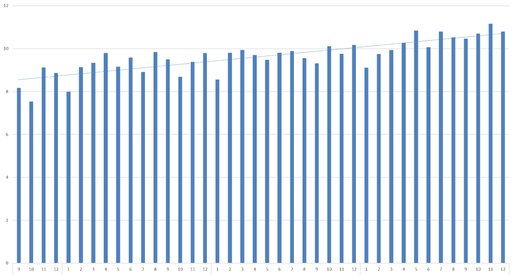Y-axis: Number of notes left to write at the end of the day. X-axis: number of days since starting the spreadsheet data collection.