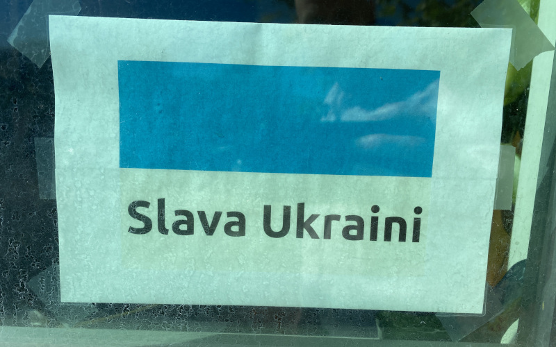 The next day I made a Ukraine flag with the words โSlava Ukrainiโ written on the gold stripe and taped it to the window in my office. It is still there today, a little faded from the sun.