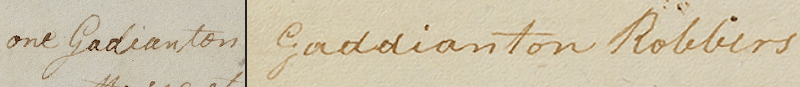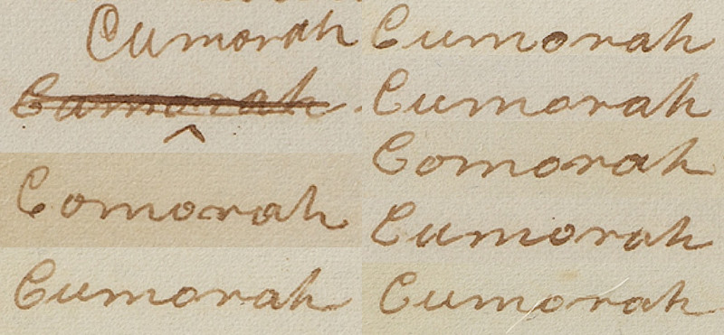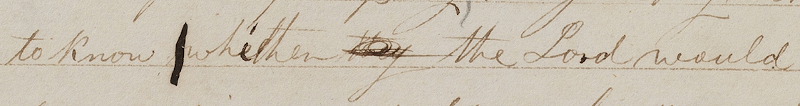 The current edition changes “whether” to “whither,” which changes the question asked of Alma from, “Should we go and try to find our kidnapped countrymen?” to “Where should we go to find them?” In the printer’s manuscript of the Book of Mormon the original writing reads “whether,” but the “e” is turned into an “i” by a revision using a different pen.