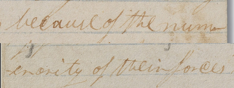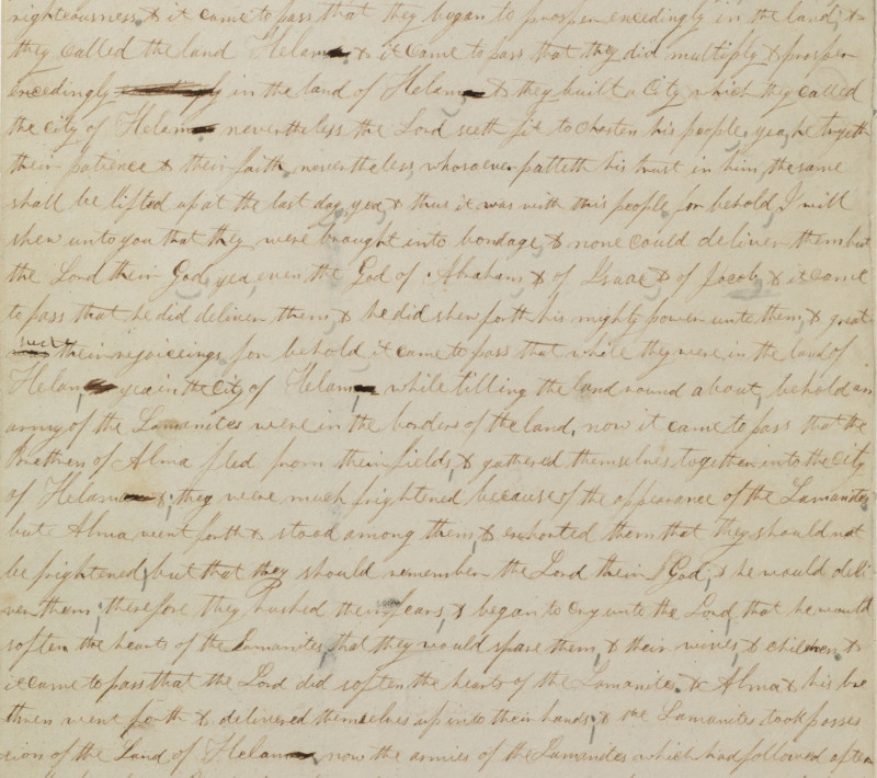 This one is a little weird. “Numerority” is not a real word. I couldn’t find any references to it online, except in websites referring to this verse in the 1830 edition of the Book of Mormon. Perhaps the word “numerosity” should have been used, which has the meaning that this passage seems to imply. You could almost imagine that the second “r” in the word is actually an “s,” when you compare it to the “s” in “because” and in “forces.” Others have suggested the right word here is “enormity,” but the manuscript clearly doesn’t say that. The original manuscript is illegible in that word. Regardless, the words “of the numerority of” were removed in a later edition, and the verb “having” was changed to “had.” Problem solved.
