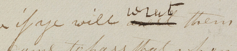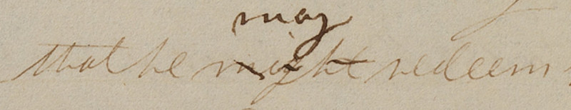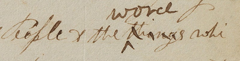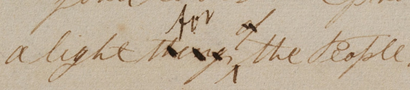 Arrest is obviously the wrong word here. On the printer’s manuscript is has been scratched out and replaced with “wrest,” which is a verb that means to grab something by twisting or forceful movements. Again the original manuscript page has been destroyed, but it seems possible that this was a transcription or dictation error.